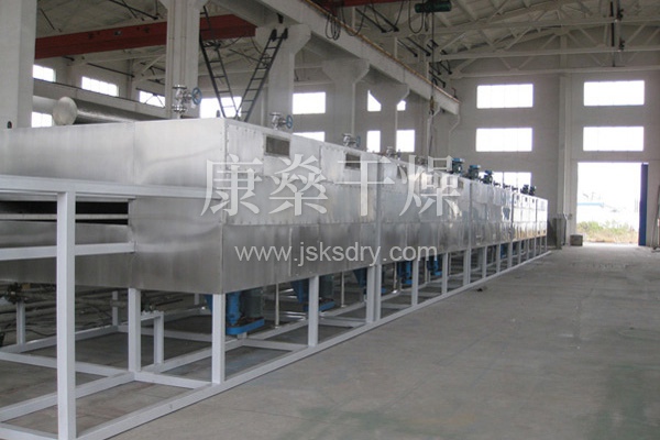 物料由加料器均勻地鋪在網帶上,網帶一般采用12-60目不銹鋼絲網,由傳動裝置拖動在干燥機內移動。干燥機由若干單元組成,每一單元熱風獨立循環,部分尾氣由專門排濕風機排出,廢氣由調節閥控制,熱氣由下往上或由上往下穿過鋪滿物料的網帶完成熱量與質量傳遞的進程,帶走物料水份。網帶緩慢移動,運行速度可根據物料溫度自由調節,干燥后的成品連續落入收料器中。上下循環單元根據用戶需要可靈活配備,單元數量亦可根據需要選取。